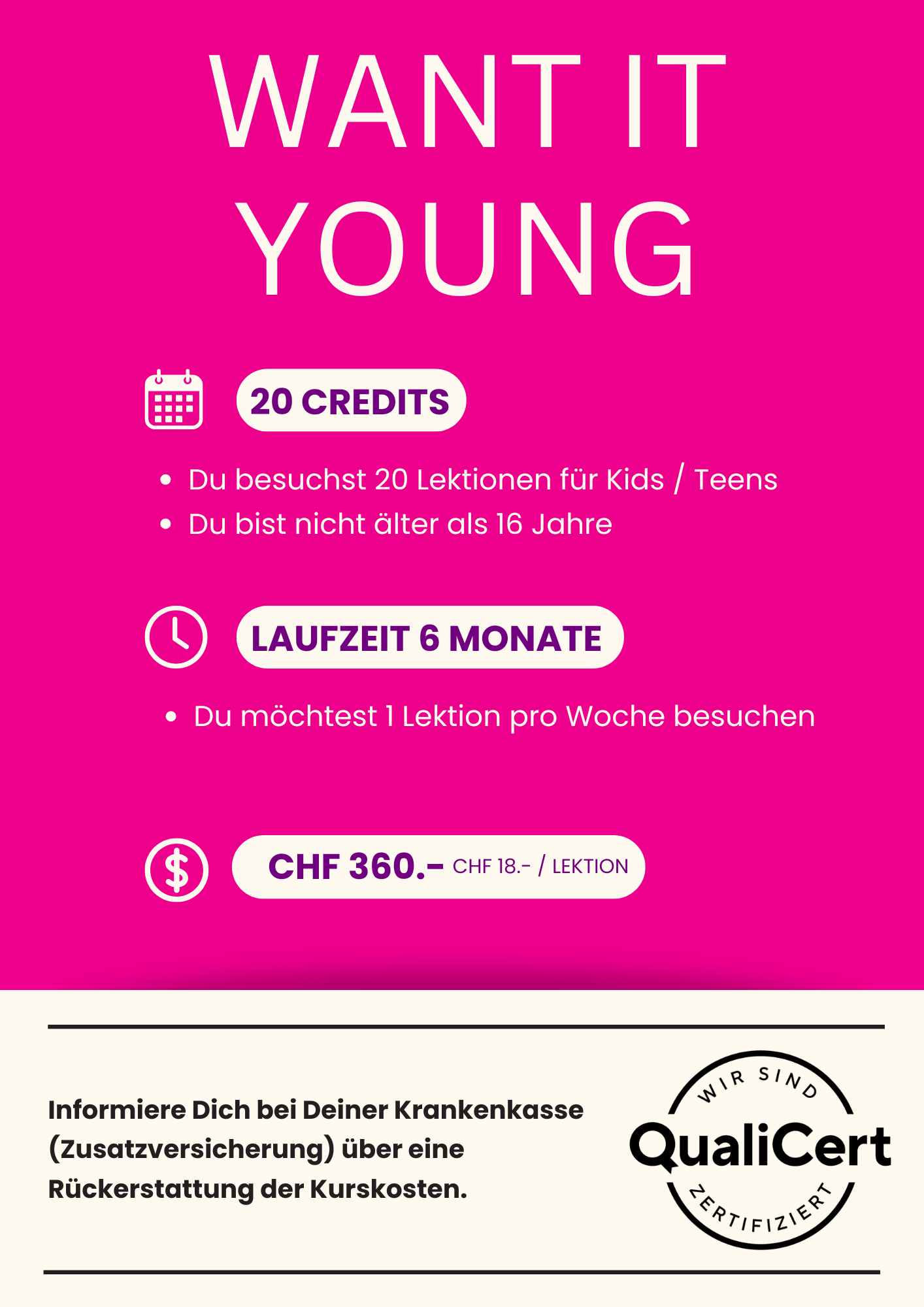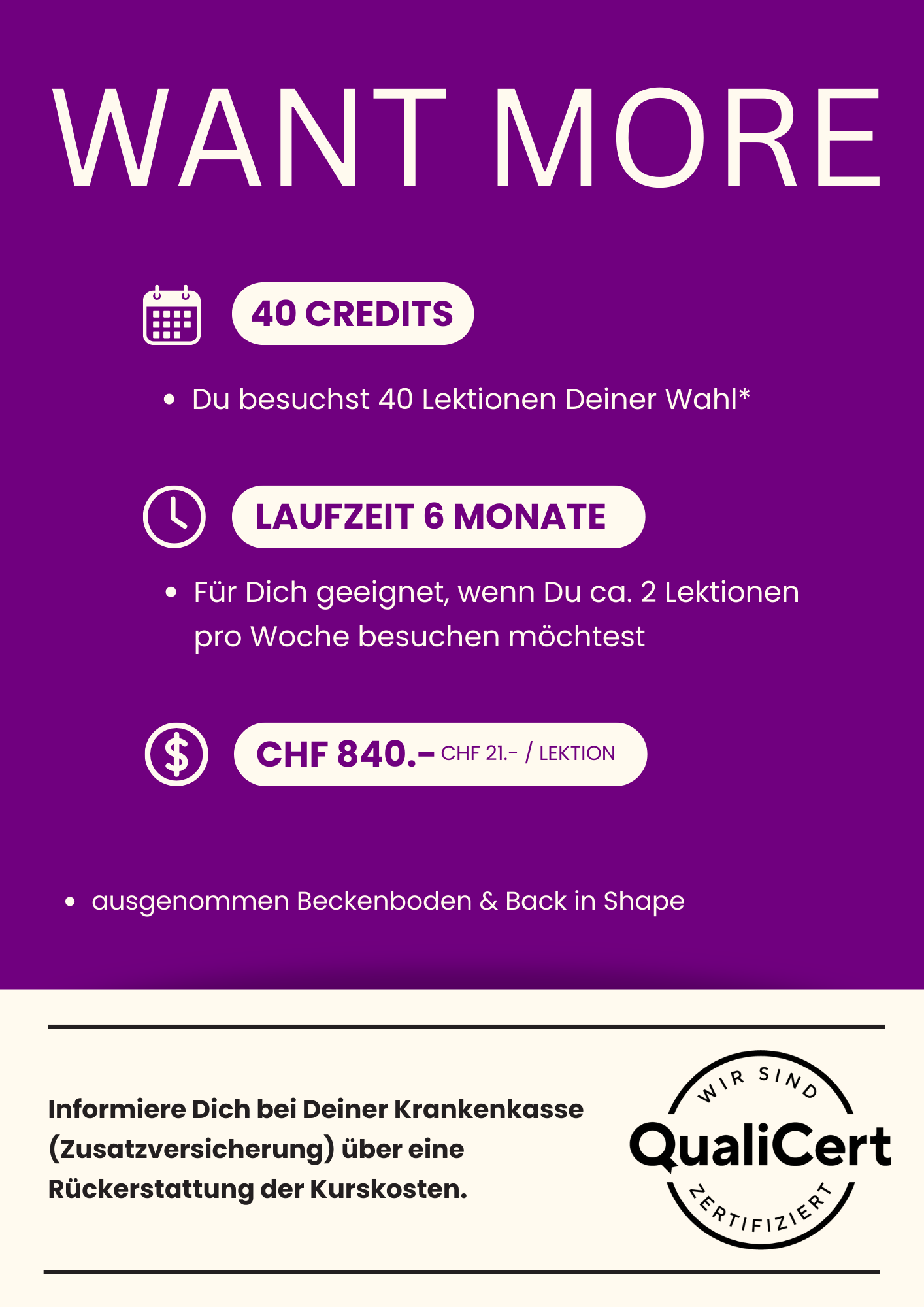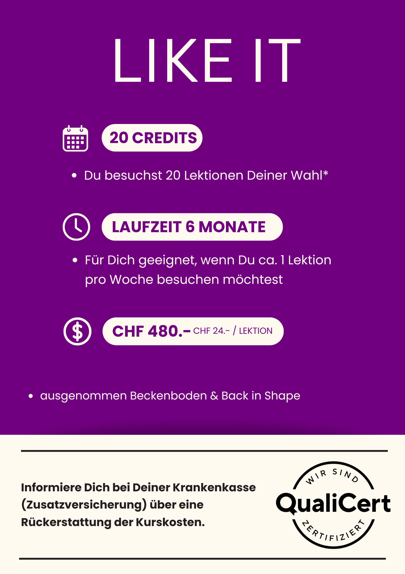 20 Credits, 6 Monate gültig CHF 18.- / Lektion