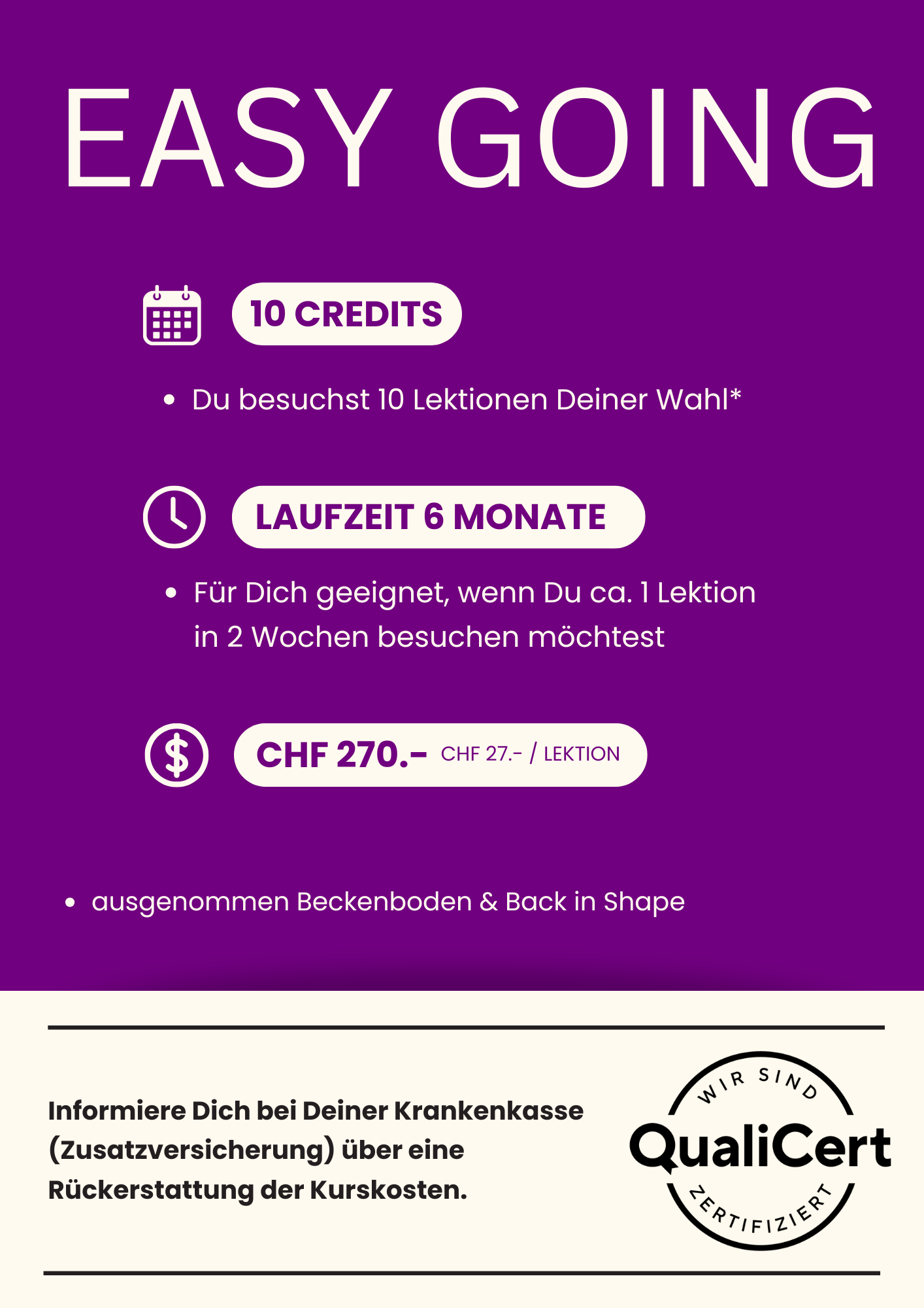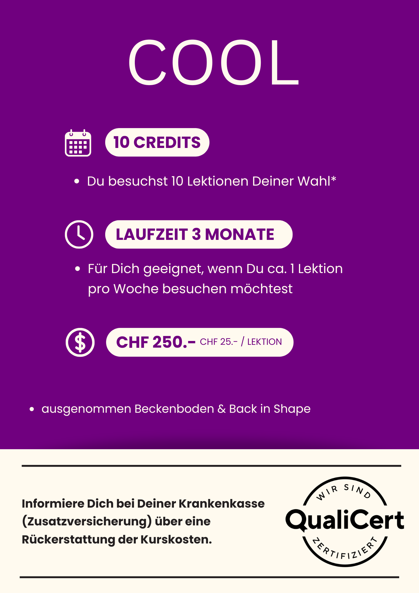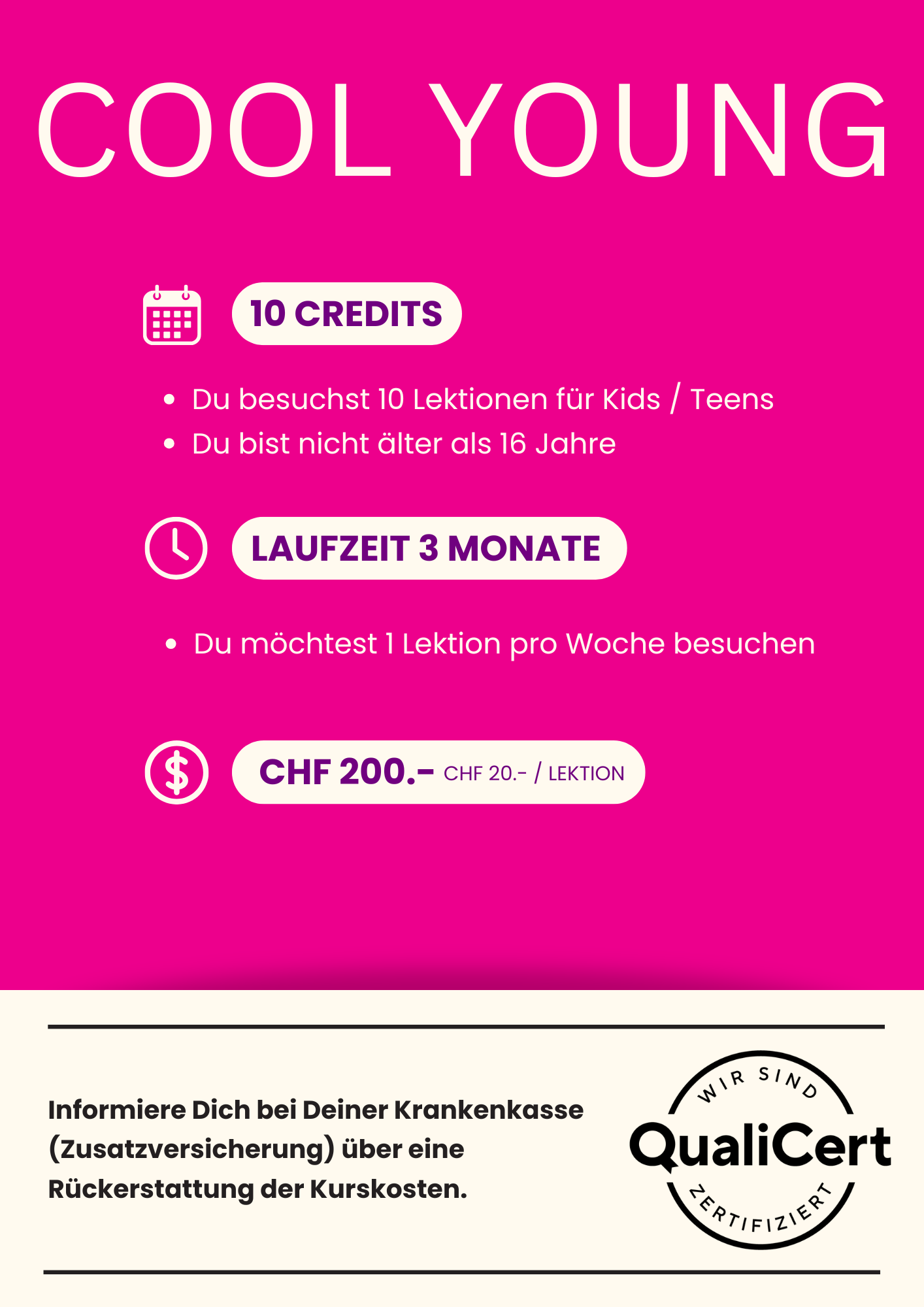 10 Credits, 3 Monate gültig CHF 20.- / Lektion