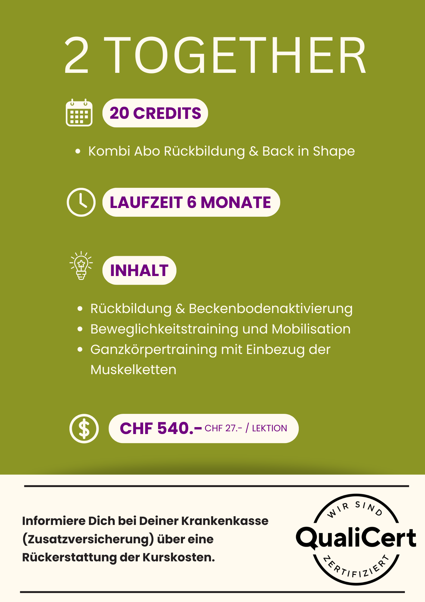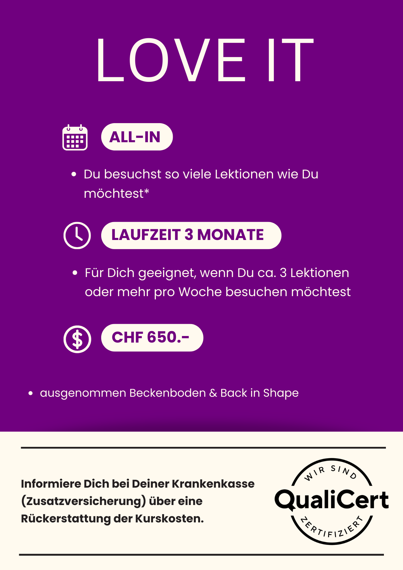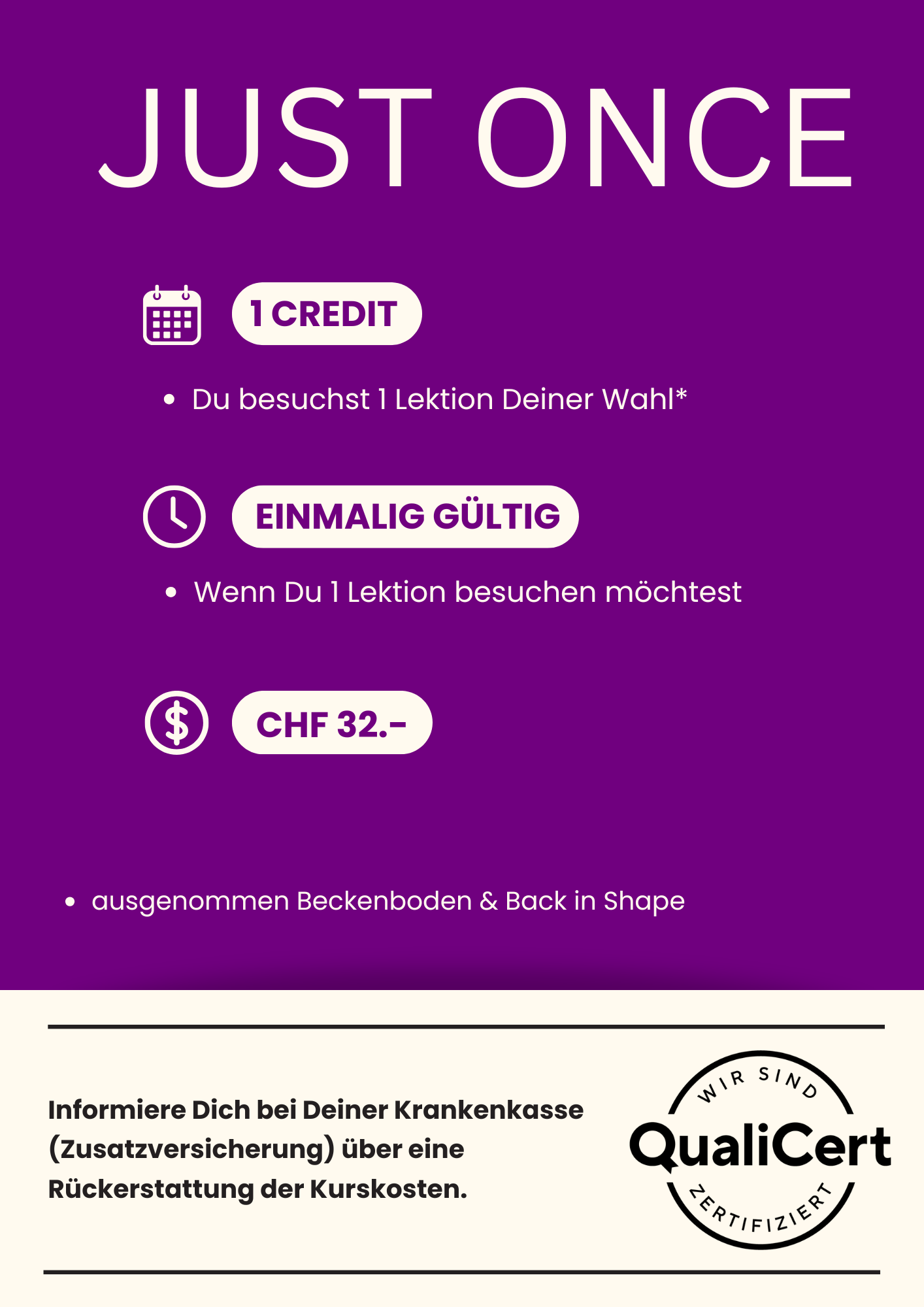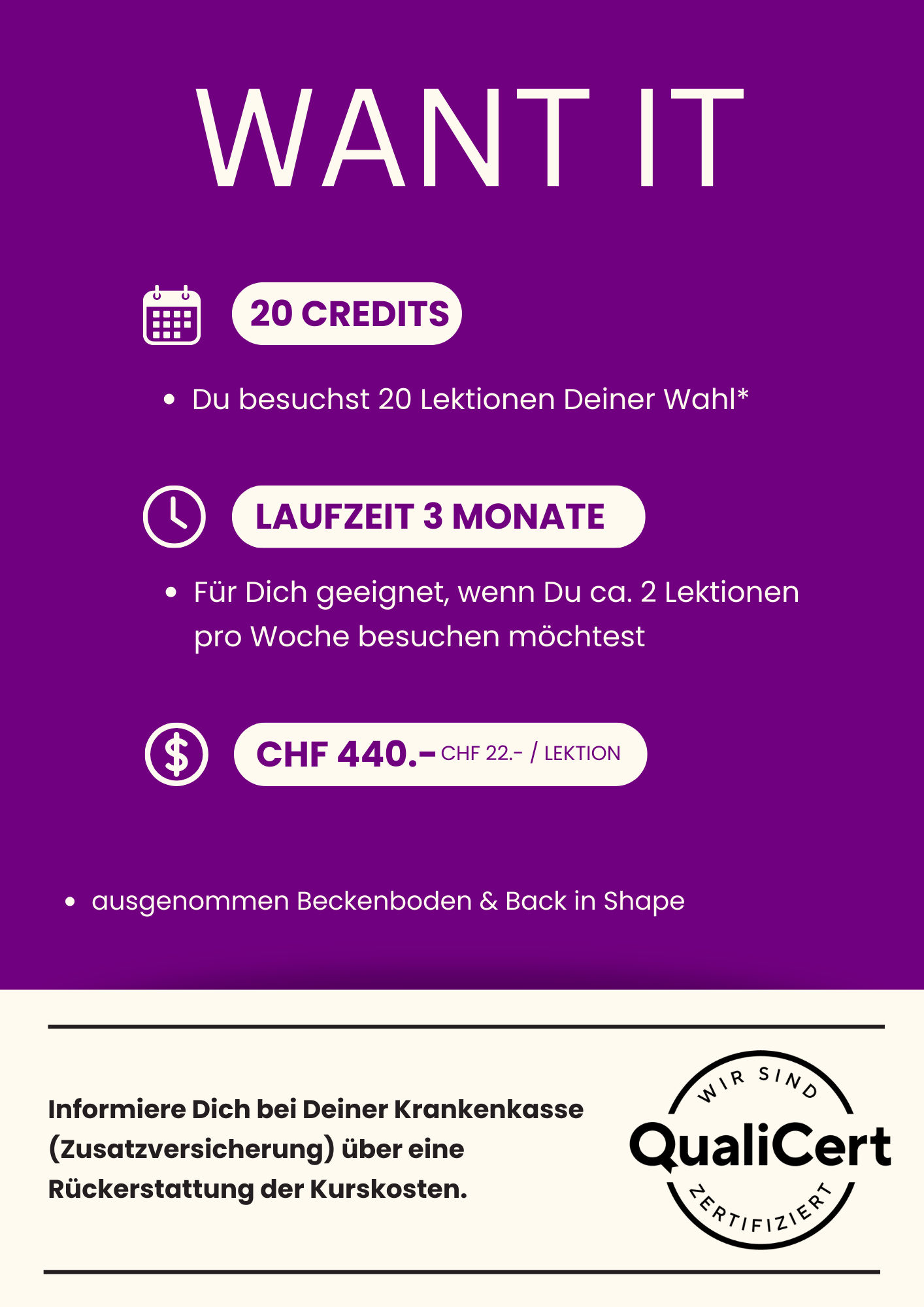 10 Credits, 3 Monate gültig CHF 20.- / Lektion
