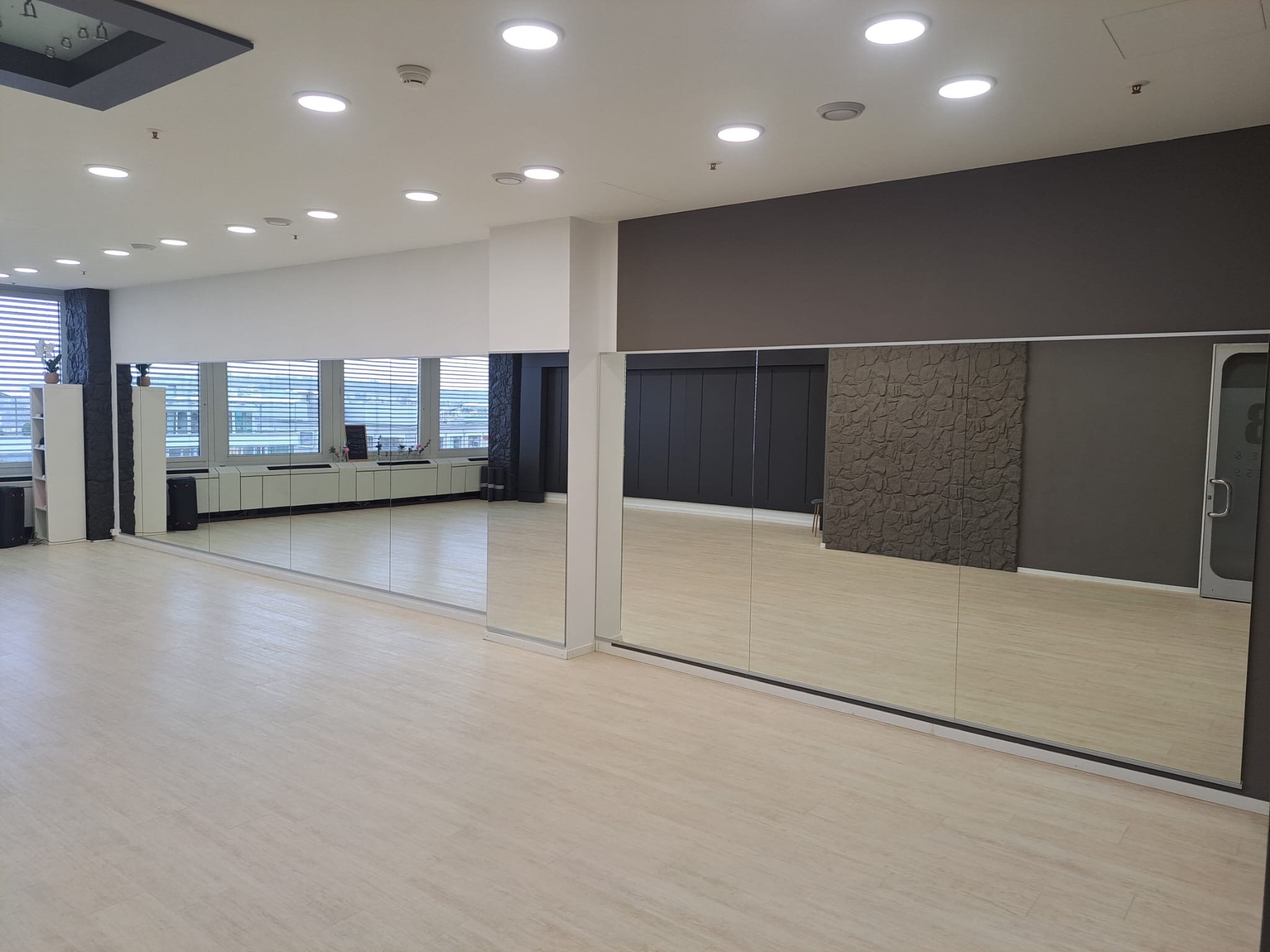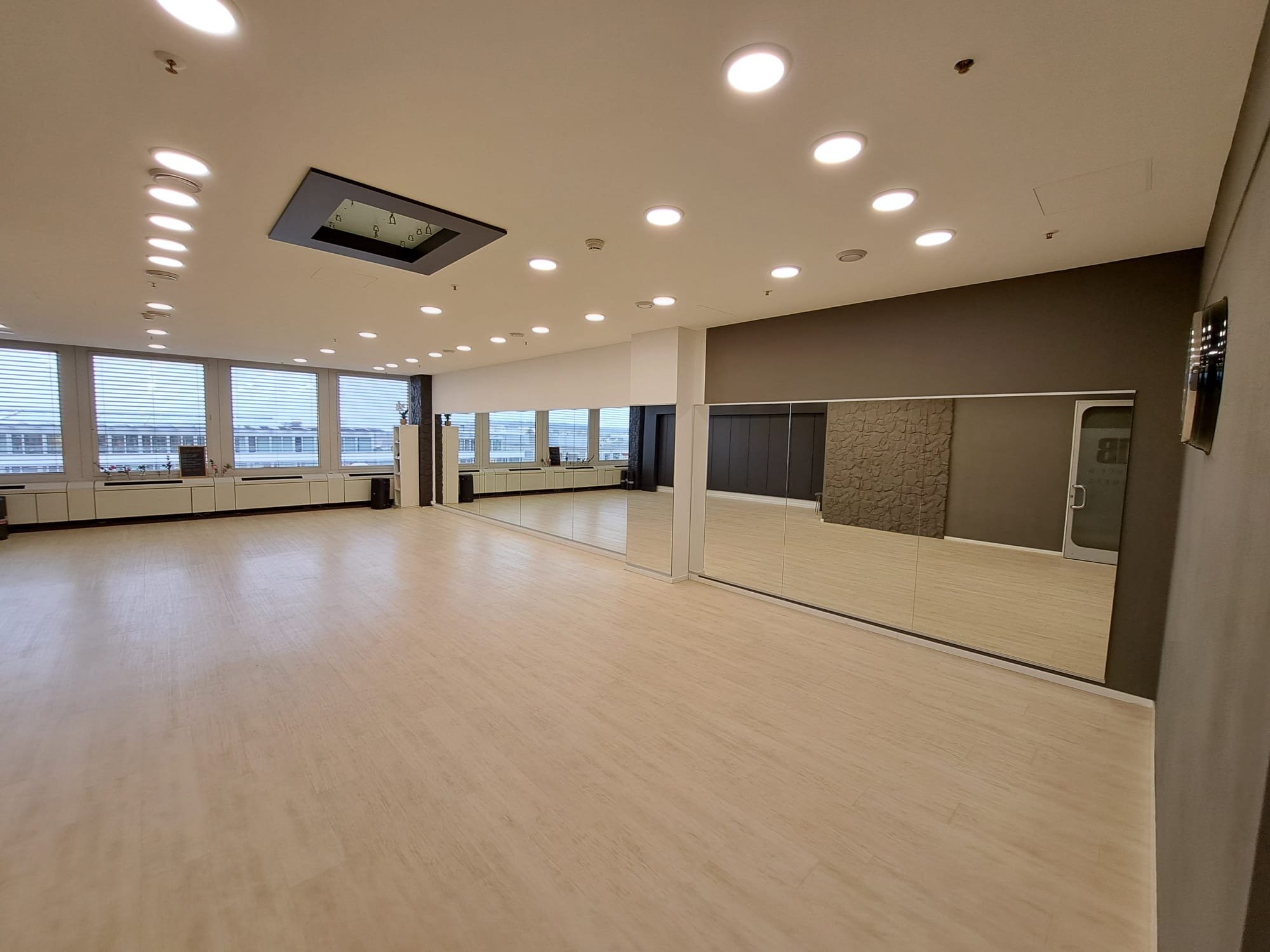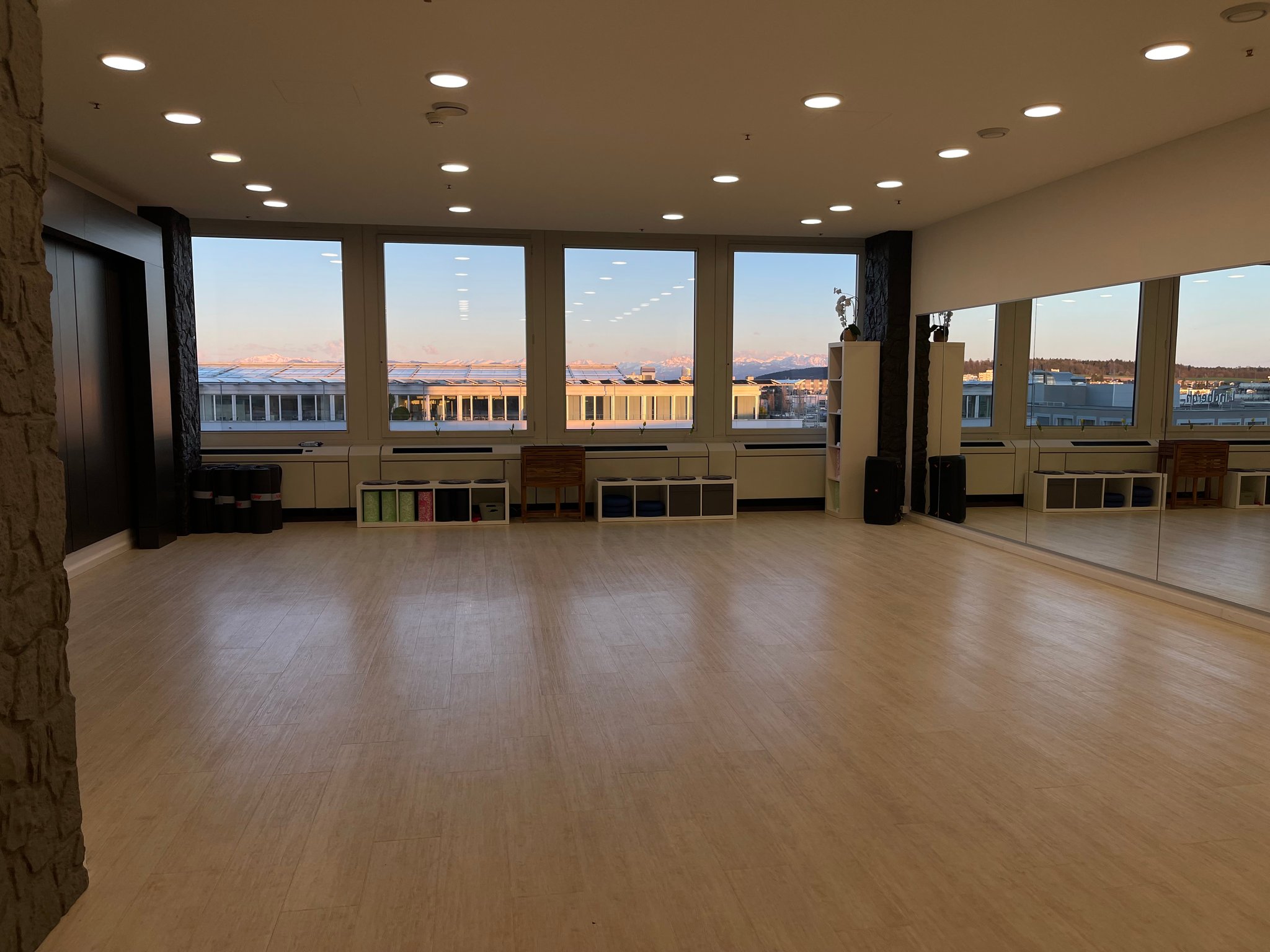Der helle Raum mit Aussicht auf die Berge befindet sich im 6. Stock vom TMC Gebäude beim Glattpark (Opfikon). Er verfügt über eine kleine Garderobe mit Küche (inkl. Kühlschrank, Kaffeemaschine, Gläser, Tassen) sowie einer Spiegelfront. Matten, Kettlebell, Softbälle und Balance Pads sind vorhanden und können mitbenutzt werden.